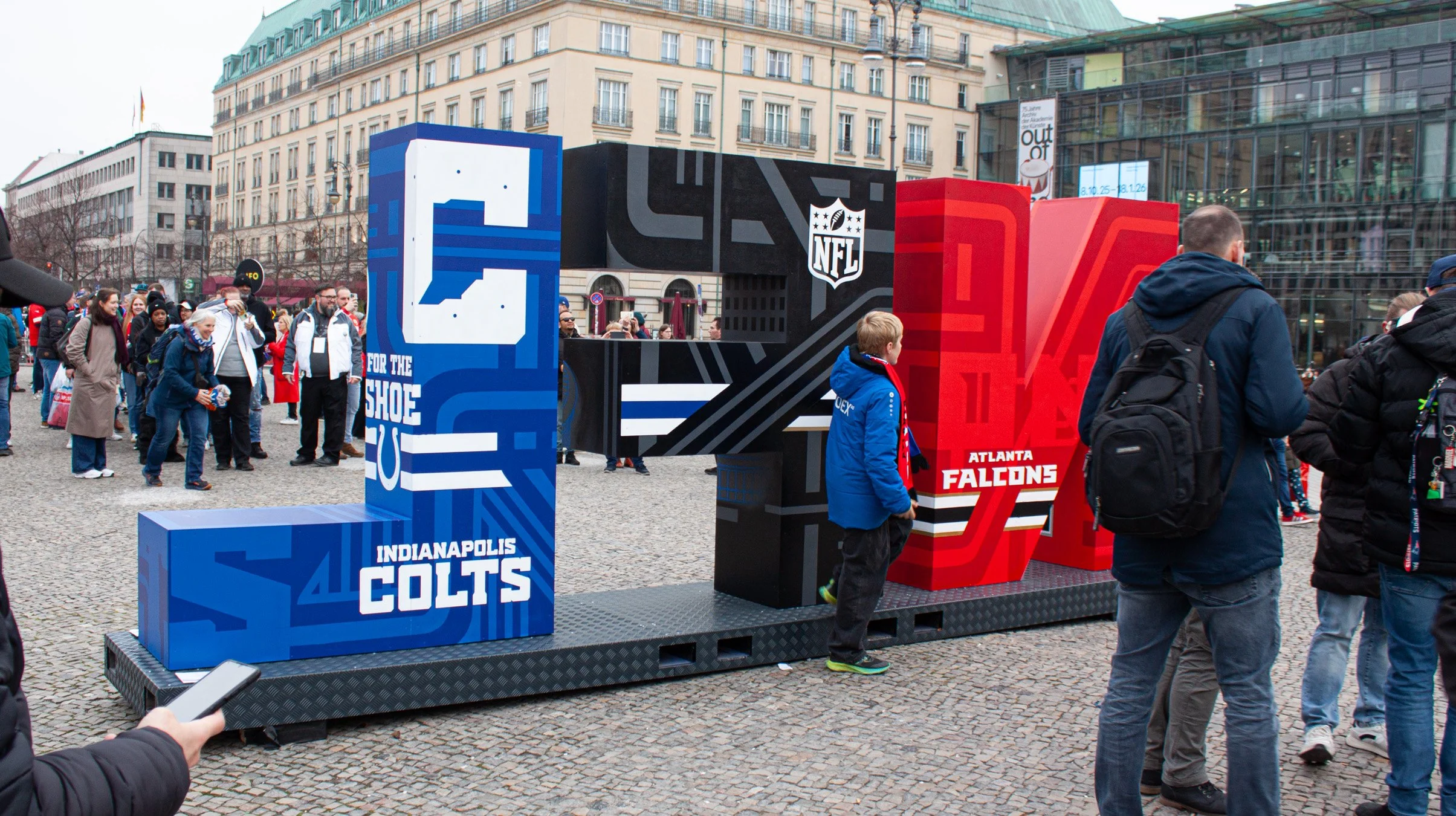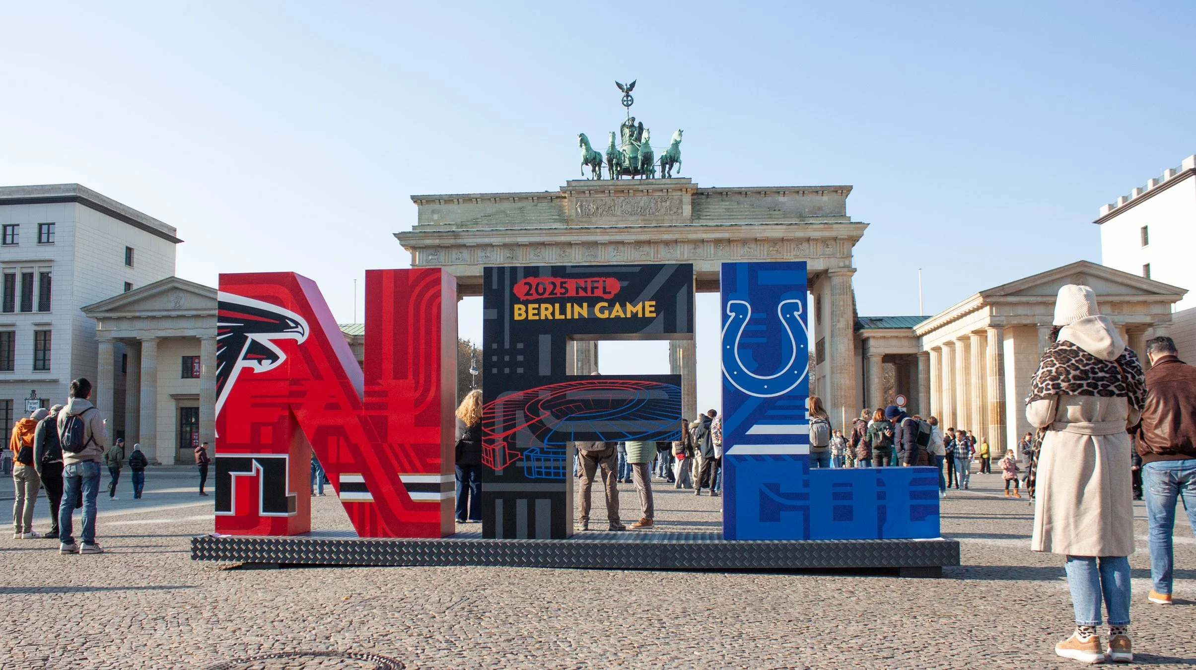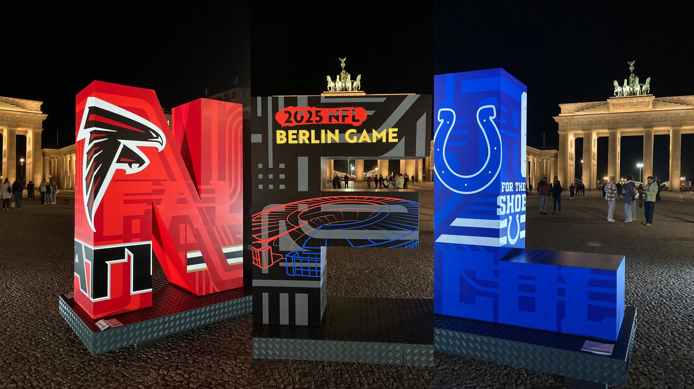 Large-scale spraypainted letterforms created for the NFL Berlin Game, featuring Atlanta Falcons vs Indianapolis Colts at Berlin`s Olympic Stadium. Completed at the Brandenburg Gate, the installation became the event’s most popular photo spot.